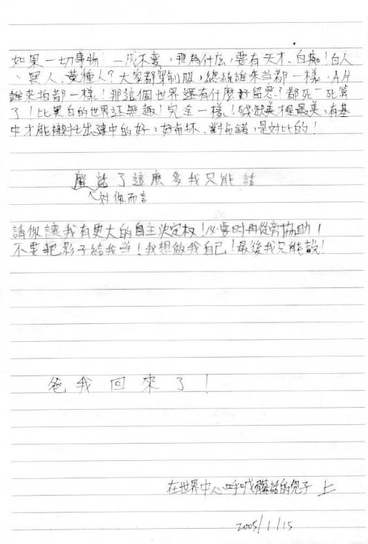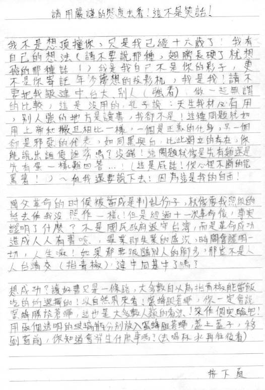 寫這封信是為了化解作者跟他爸的誤會.... 就因為出門去基隆文化中心看書,沒坐計程車回家~~被罵~ 然後,用累積已久的怨忿寫出來的 內容引經據典還附實驗證明...真是太讚了 ! ㄏㄏ 第二頁尤其精彩!! 這個小孩......前途無可限量!!